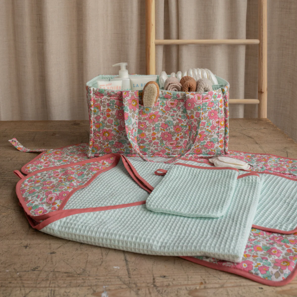 Sofia est un ensemble de 4 patrons pensés autour de l’univers du bain et du change de bébé : un tapis à langer nomade, une cape de bain, un gant de toilette et un organisateur. Des options oreilles sont proposées pour la cape de bain et le gant de toilette.