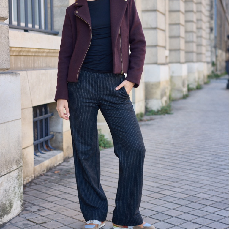 Patron de pantalon à pinces à la taille totalement ou partiellement élastiquée mais au volume travaillé pour être particulièrement seyant. Jambe droite terminée par un ourlet simple ou un revers surpiqué. En option: fausse braguette, poches italiennes sur le devant et poches plaquées au dos. A porter taille basse ou mi-haute.