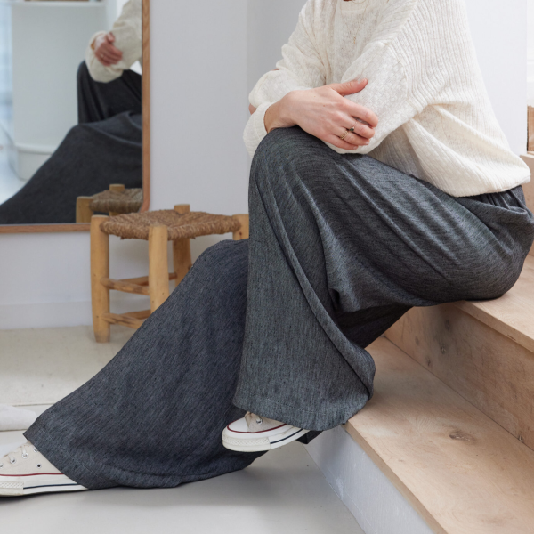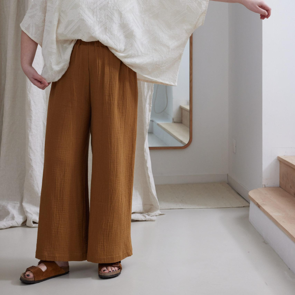 C’est un modèle très facile à coudre, accessible aux débutants, avec une ceinture intégrée et uniquement 3 pièces à couper. Le patron prévoit, 2 hauteurs de jambes (cheville ou long). il est important de choisir une matière fluide qui lui donnera un tombé adapté à sa coupe.