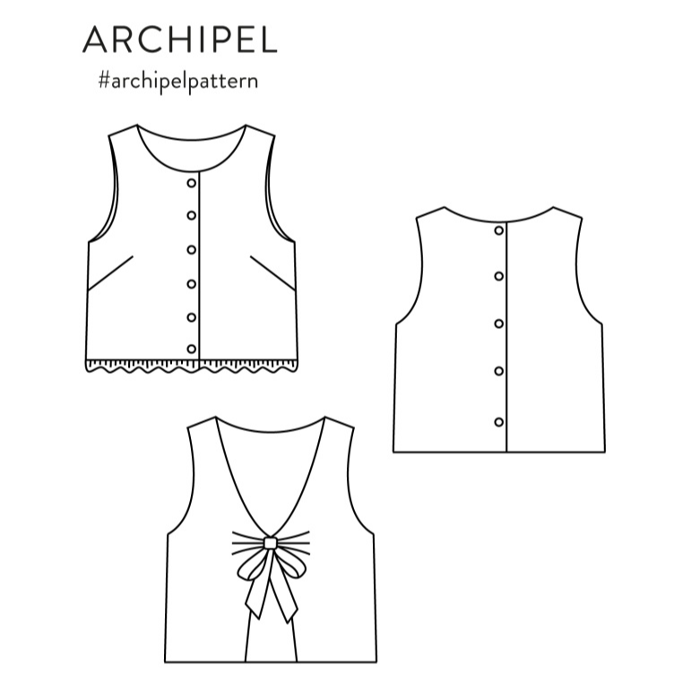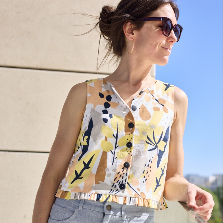 Patron de top sans manches boutonné ou noué aux lignes simples mais travaillées pour un tombé impeccable. 3 options de fermeture : boutonnage sur le devant, sur le dos, ou fermeture nouée au dos (soutien-gorge compatible). Finitions impeccables grâce à une doublure totale prise en fourreau. Le tout avec, en option, l’ajout d’un froufrou au bas du top pour encore plus de féminité ! Possibilité de le faire réversible.