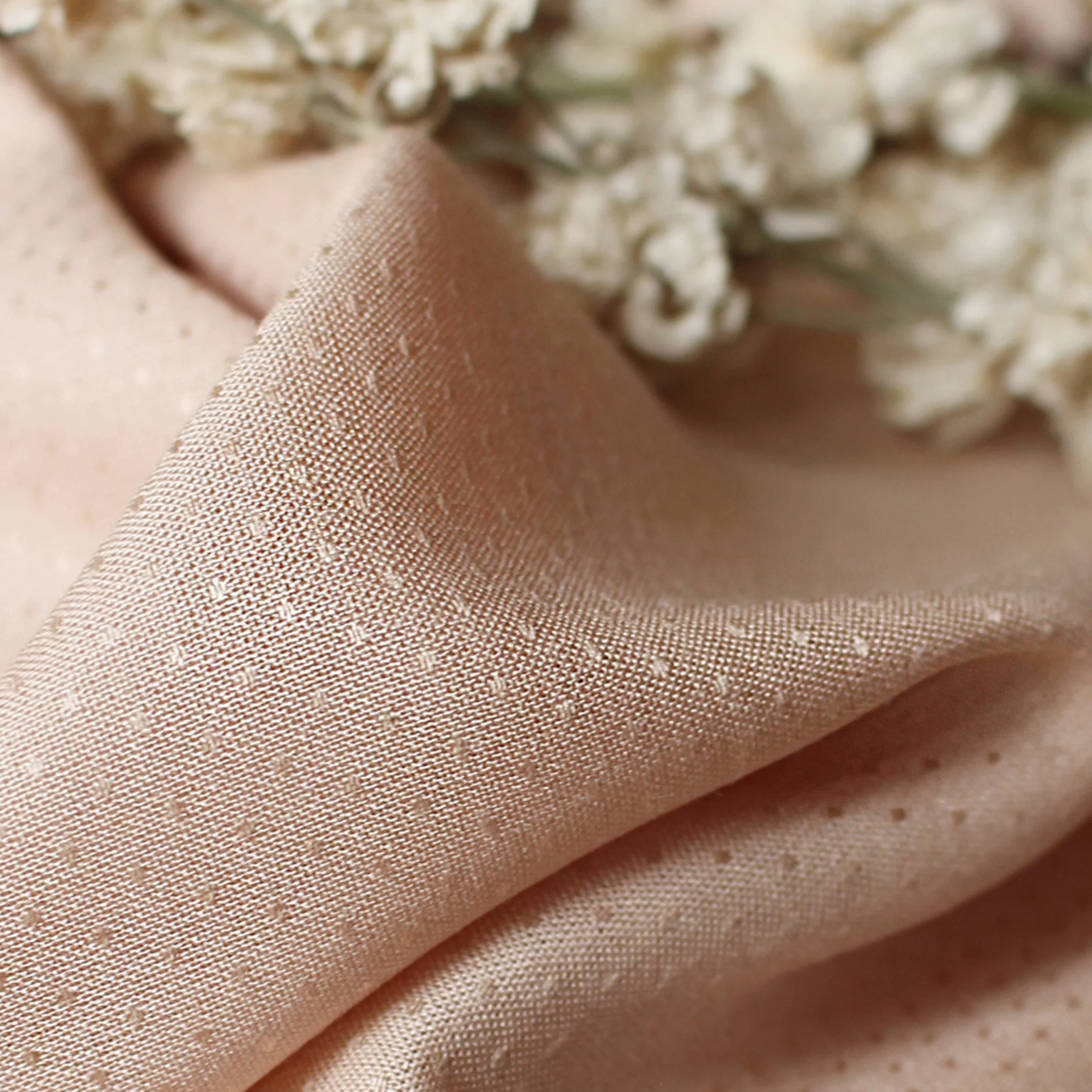 Avec ses délicats pois brodés et sa subtile brillance, la viscose plumetis « Dobby » revêt la couleur « Blush » pour un dressing romantique et somptueux. Étoffe légère au tombé impeccable, les tissus « Dobby » Atelier Brunette sauront convaincre votre clientèle.