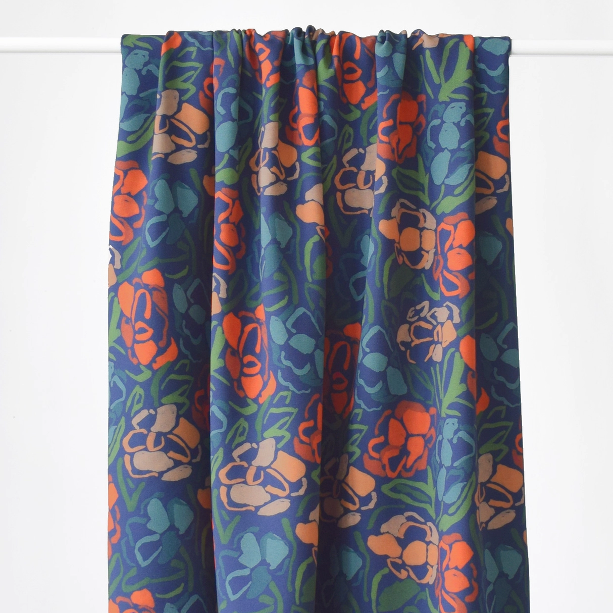 Tissu viscose Roseraie Midnight, un parterre de roses multicolores sur fond leu nuit.